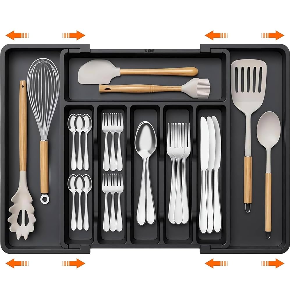 Keep your kitchen drawers tidy and organized with our Expandable Utensil Tray! This adjustable silverware organizer is designed to fit your specific needs, providing ample space for your flatware and cutlery